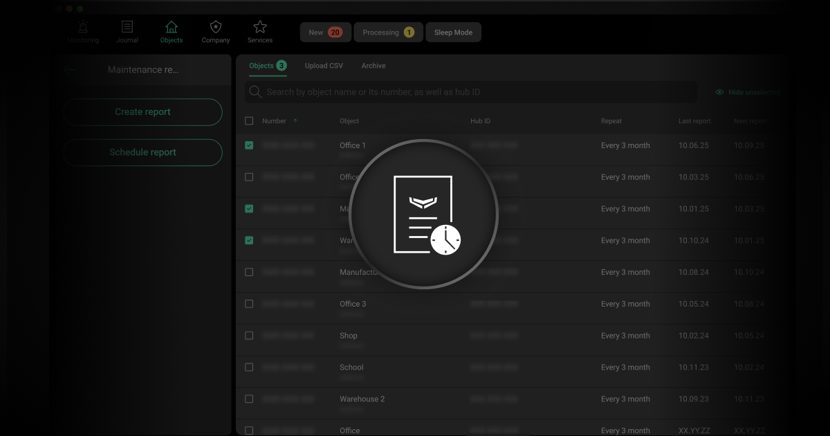 With Ajax PRO Desktop 5.27, maintenance reports can be sent automatically — no manual actions are required. This means routine system checks occur on schedule, without adding to your team's workload.