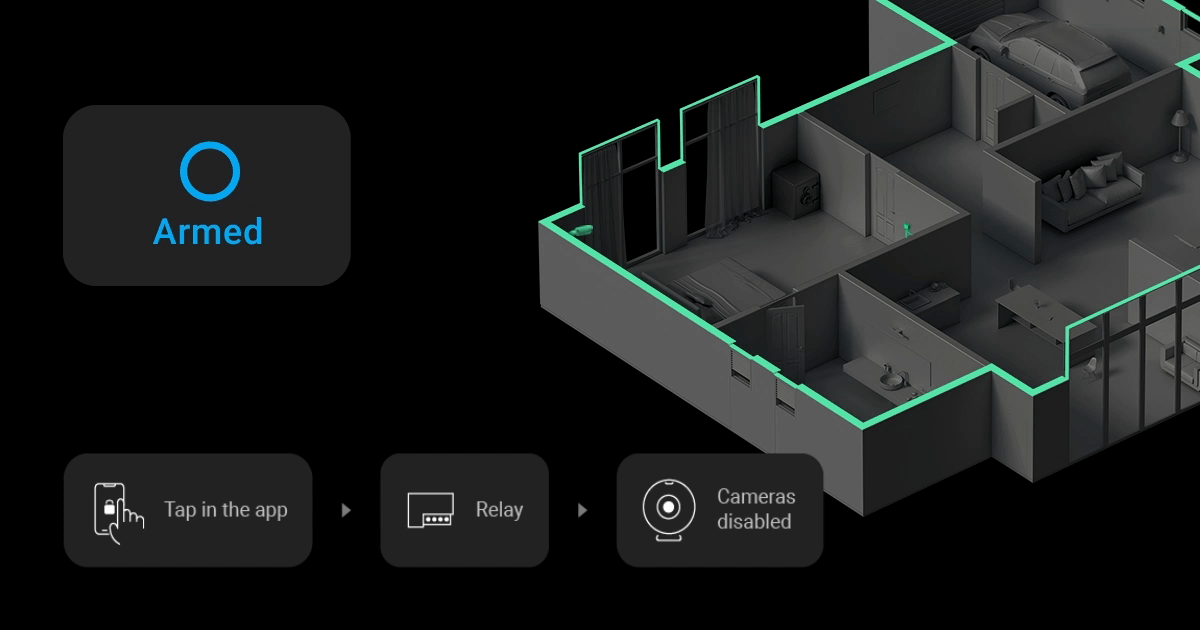 Another way to turn surveillance cameras off is to do it automatically using a scenario. The scenario is set by a user based on habits, wishes, and lifestyle. For example, it is convenient to have cameras disarmed every time the system is disarmed. The cameras will reconnect once the system is armed, and all the benefits of video surveillance will be available.