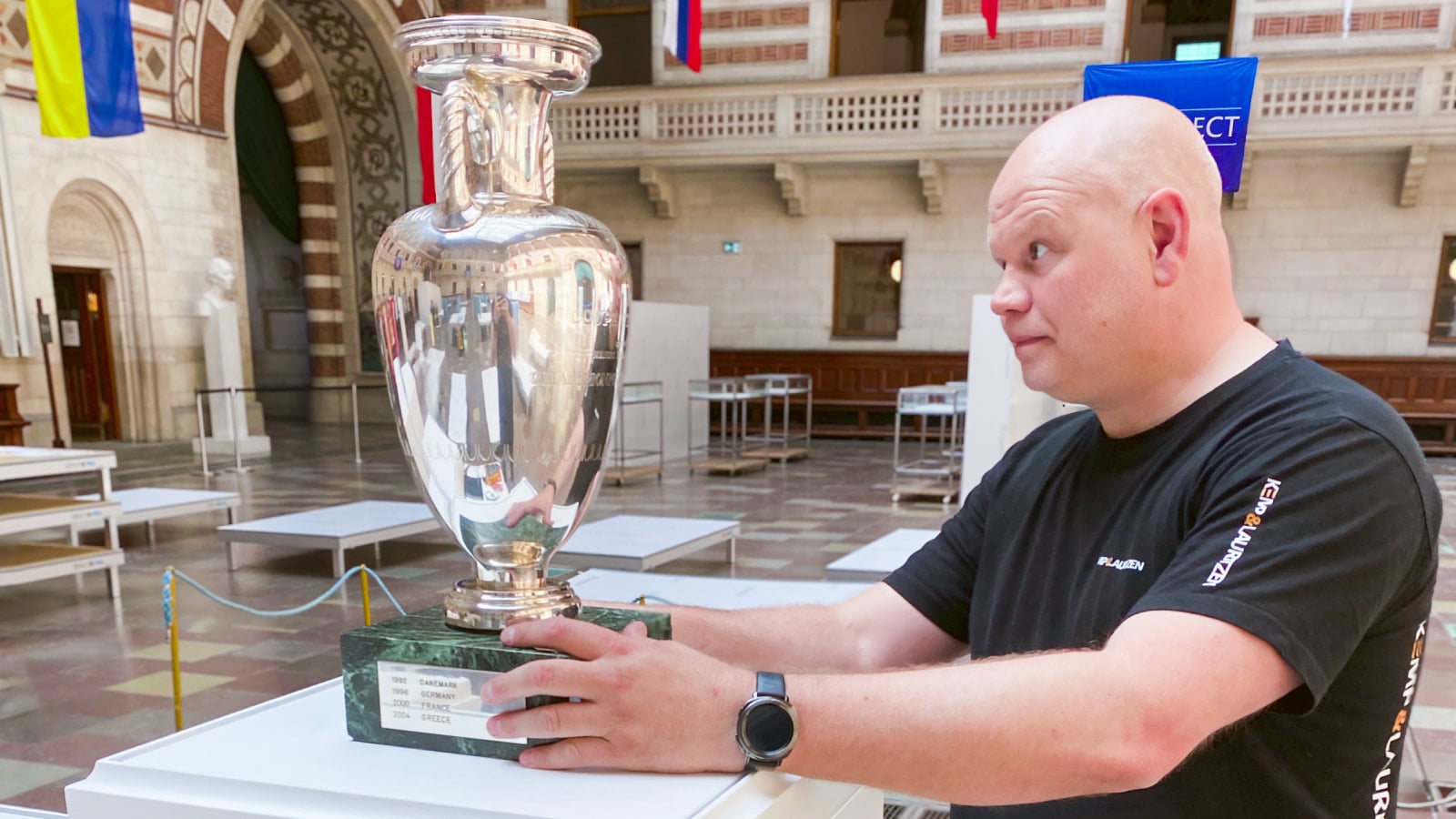 The main memorabilia presented at the exhibition were the uniforms of famous football players: Michel Platini, Gary Lineker, Eric Cantona, Frank Rijkaard, Michael Laudrup, and many others. There was even an exhibit displaying a plaster cast of the leg of Danish player Henrik Andersen. He broke his leg in the semi-final against the Netherlands during EURO 1992. And in the final that same year, Denmark beat Germany 2-0 and won the European Championship trophy. The Cup became the centerpiece of the exhibition.