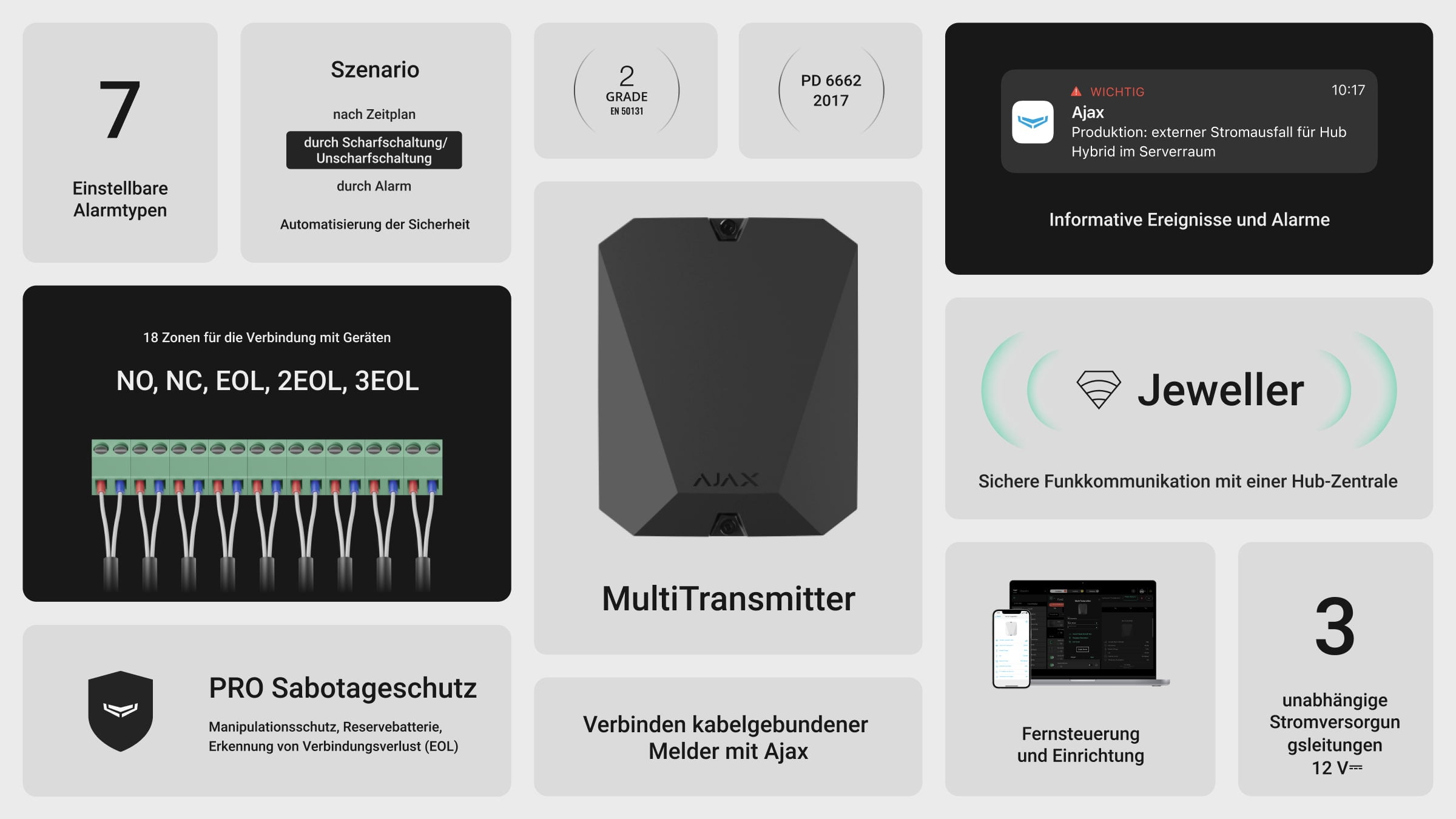 Das neue kabelgebundene Sortiment der Fibra Geräte hat alle Vorteile der kabellosen Jeweller Technik übernommen. Verschlüsselte und gegen Sabotage geschützte Datenübertragung, unübertroffene Reichweite und Energieeffizienz, Fernsteuerung und -wartung, schnellstmögliche Installation — alles, was Benutzer an Ajax Systemen lieben.