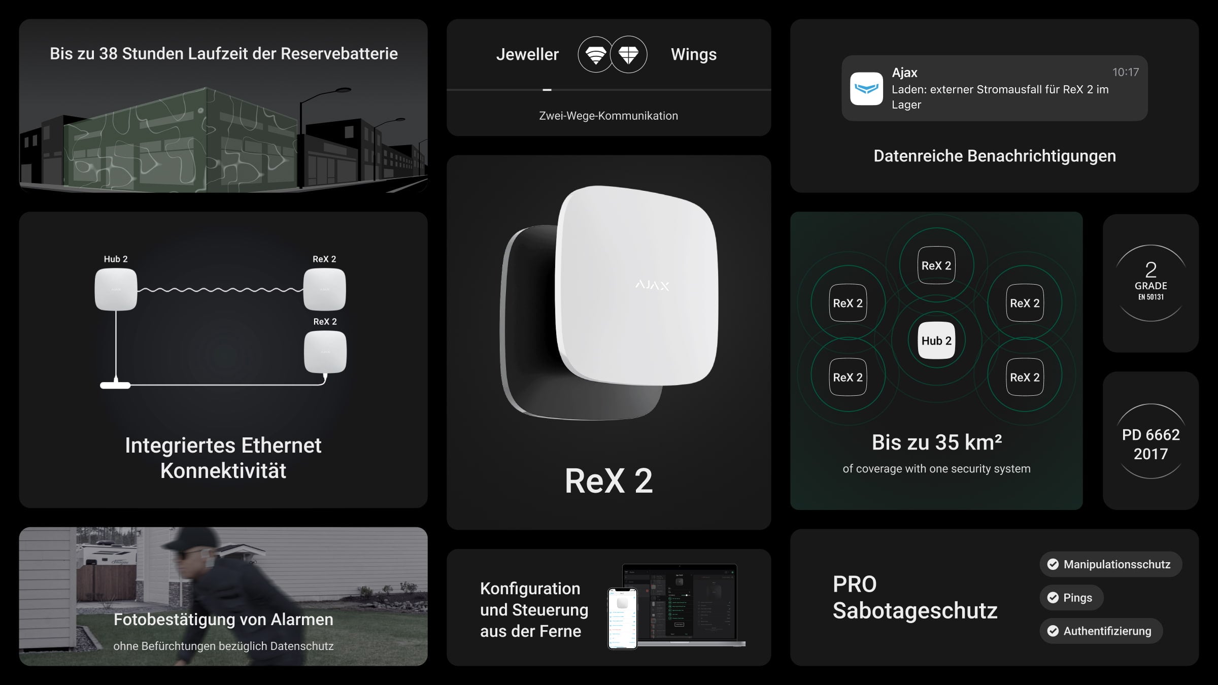 ReX 2 verdoppelt die Funkkommunikationsreichweite von kabellosen Ajax Geräten einschließlich der MotionCam Melder. Ein System kann über bis zu fünf Funk-Repeater zur Erweiterung der Signalreichweite mit einer Gesamtabdeckung von bis zu 35 km² verfügen. Unabhängig von der Größe des geschützten Bereichs werden Alarme sofort übermittelt, und das erste Foto von einem MotionCam Melder wird in 13 Sekunden bereitgestellt.