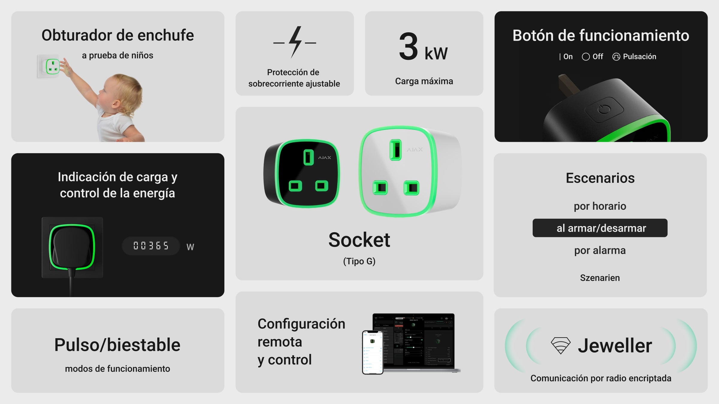 La gama de dispositivos de automatización Ajax está a punto de ampliarse aún más: El enchufe con clavija tipo G saldrá a la venta en el primer trimestre de 2022. Pero el tipo de enchufe no es lo único que cambiará. La versión británica del dispositivo tendrá un botón funcional que le permitirá controlar el enchufe sin la aplicación o el botón. Además, los ajustes serán más flexibles: un umbral de sobrecorriente configurable, el ajuste fino del brillo y la puesta a cero del contador de energía eléctrica.