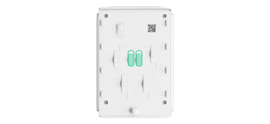 Lorsqu'il est activé, le capteur IR supérieur du détecteur reçoit un secteur de vue supplémentaire, dirigé à un angle de 40° vers le bas du secteur principal. Ceci est nécessaire pour détecter les mouvements à proximité du détecteur et réduire l'angle mort. Réglé séparément pour chaque côté à l'aide de boutons coulissants sur le panneau arrière du détecteur.