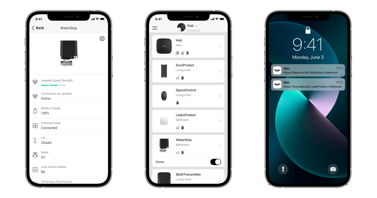 L’app Ajax dà agli utenti del sistema piena consapevolezza e controllo dell’approvvigionamento idrico. Si può vedere lo stato della valvola, ricevere notifiche istantanee e chiudere la valvola con un tocco sullo smartphone. L’interfaccia mostra un registro eventi che memorizza ogni azione all’interno del sistema.