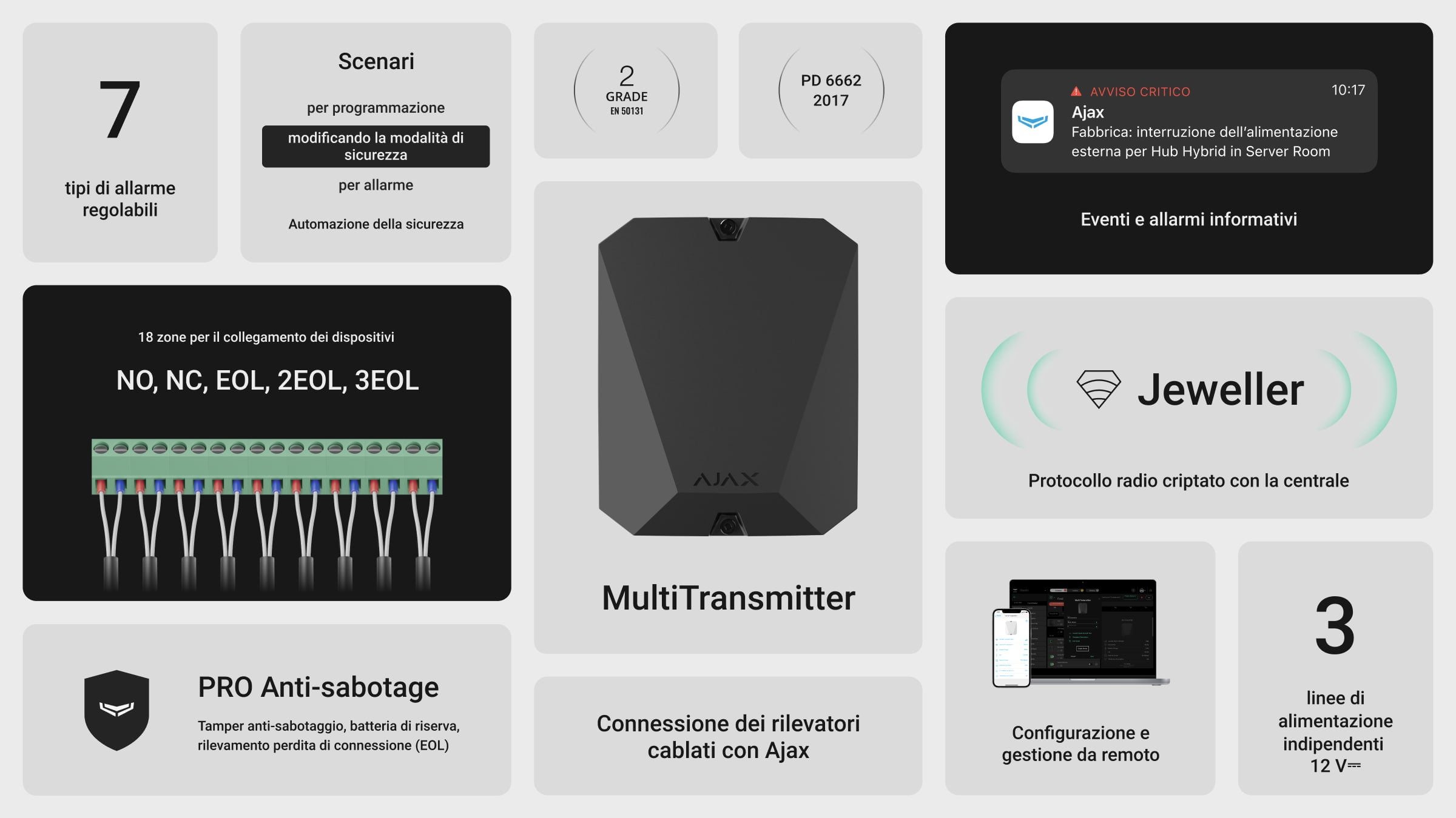 La nuova linea di prodotti cablati Fibra ha ereditato tutti i vantaggi della linea di prodotti wireless Jeweller. Trasmissione dei dati criptata e antisabotaggio, lunghezza della linea ed efficienza energetica senza precedenti, controllo e gestione da remoto, montaggio estremamente veloce: tutto ciò che gli utenti amano nei sistemi Ajax.