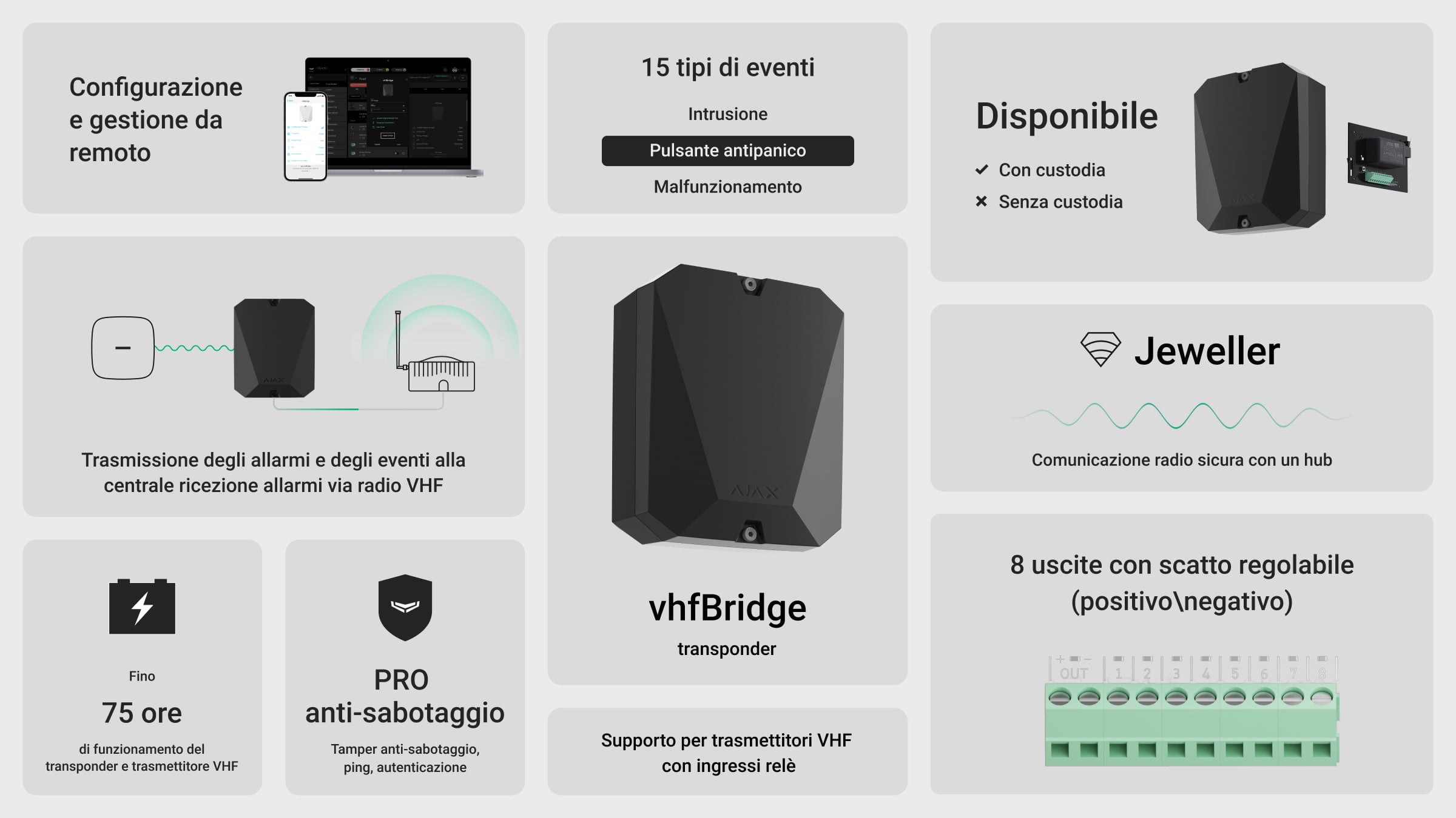 VhfBridge è dotato di 8 uscite per connettere un ripetitore VHF di terze parti. Anche in caso di interruzione di corrente elettrica il modulo può alimentare il ripetitore grazie alla batteria di riserva integrata.