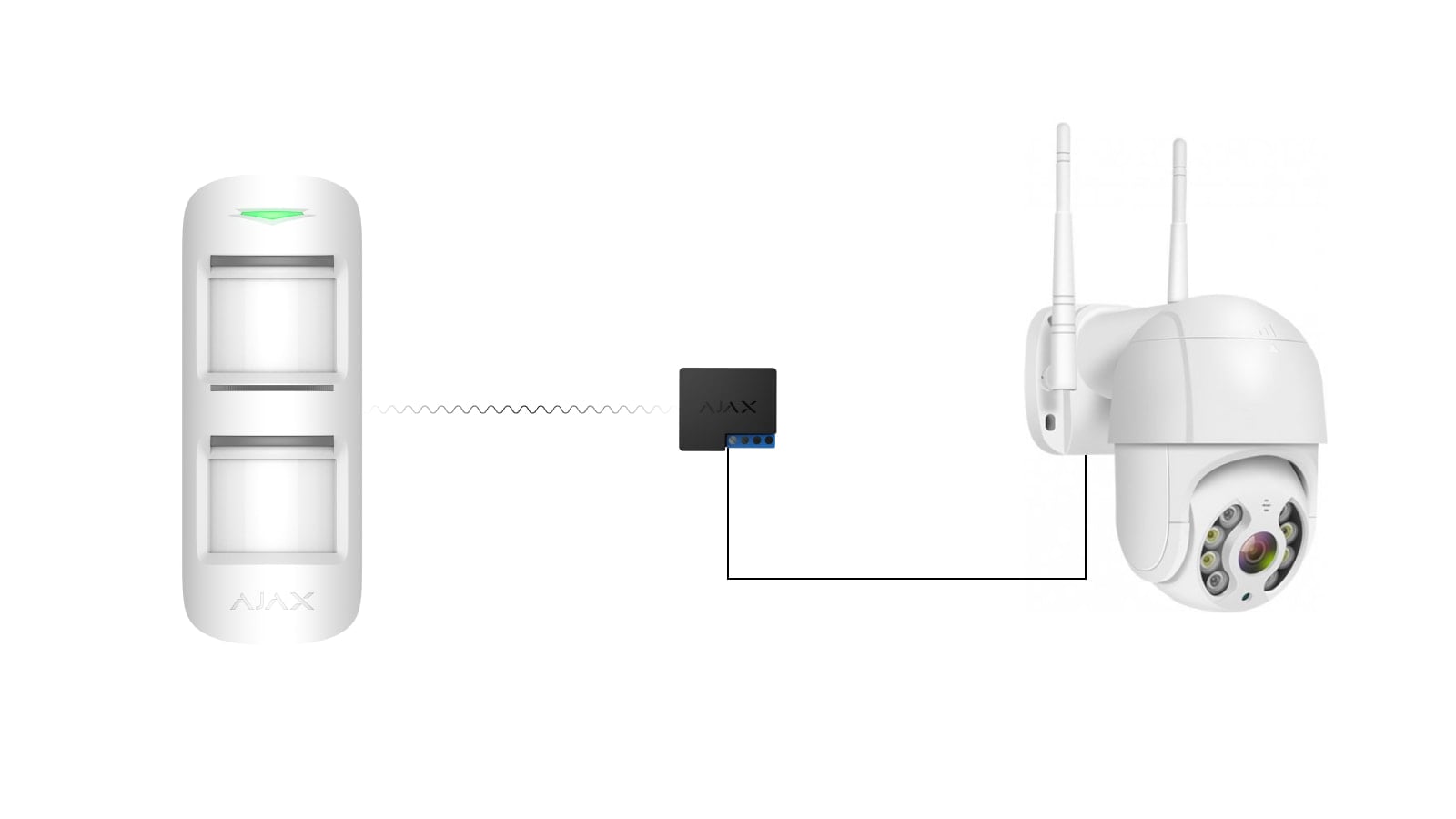 Una telecamera di sicurezza rotante è dotata di più contatti puliti programmati per direzioni e angoli di rotazione specifici. Ogni contatto è collegato al relè Ajax programmato per far ruotare la telecamera in risposta al movimento rilevato in determinati settori dell’area protetta.