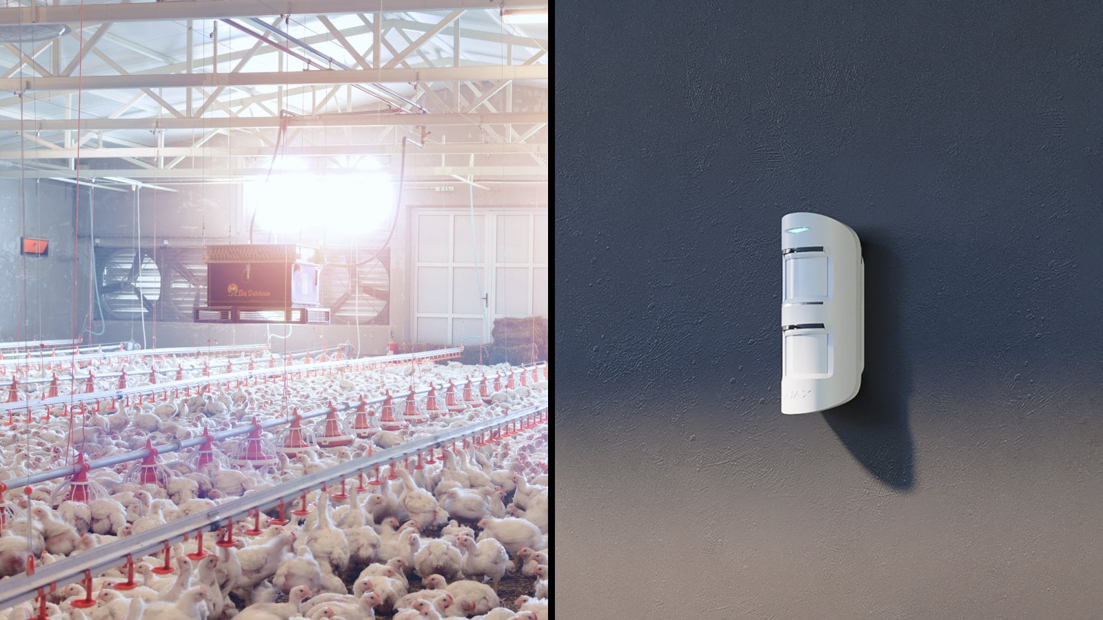 Il perimetro interno protegge l’ingresso di ciascun pollaio. A tal fine, sono stati installati i rilevatori MotionProtect Outdoor Jeweller. I dispositivi resistono perfettamente alle condizioni difficili del vestibolo d’ingresso, che comprendono l’elevata umidità, le fluttuazioni di temperatura e le soluzioni per la disinfezione utilizzate frequentemente. Grazie alla custodia IP55, il rilevatore mantiene la sua efficienza anche in un ambiente esterno aggressivo.