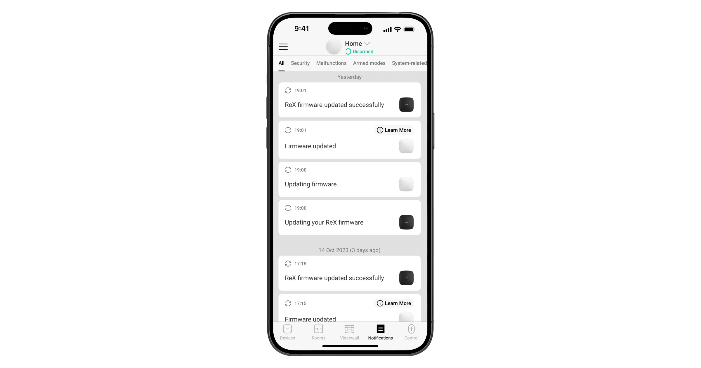 De Ajax-app geeft de volgende meldingen over het begin en het einde van de update van de firmware van de hub: