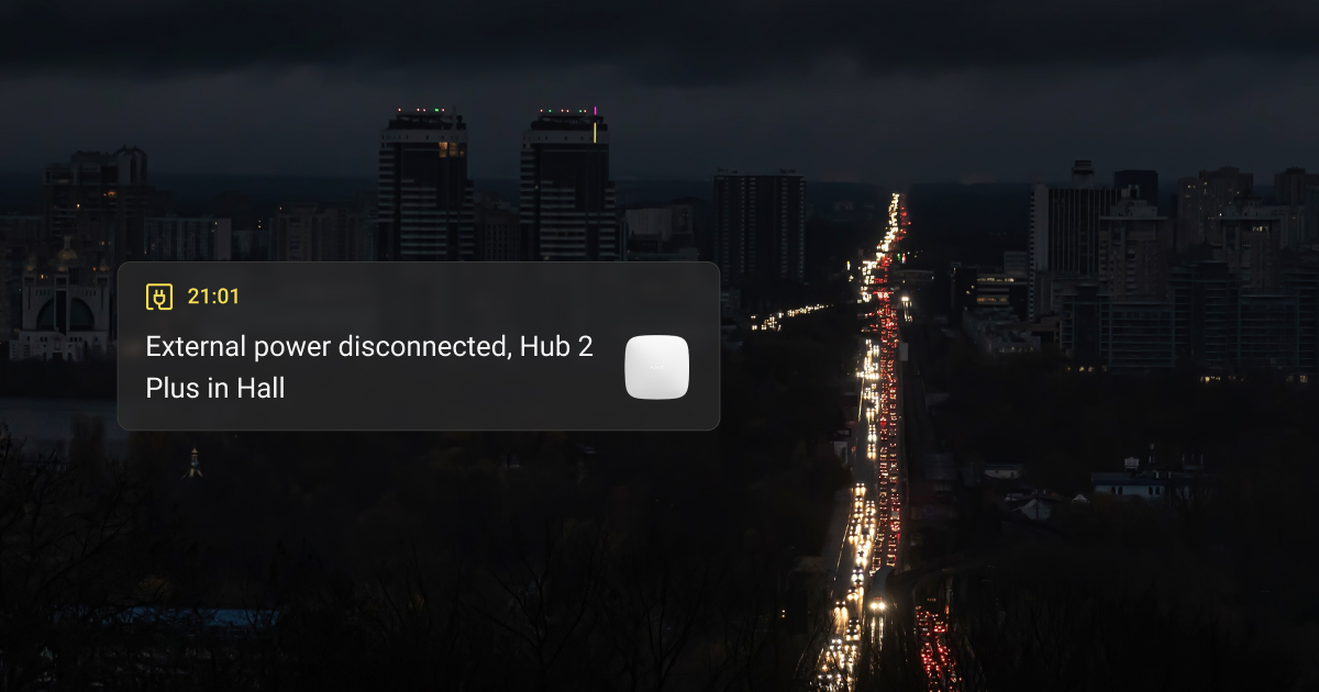 Agora, o que é que acontece quando a rede elétrica se desliga? Todos os hubs Ajax notificam instantaneamente os utilizadores da falha de energia5, pelo que saberá exatamente quando a instalação mudou para energia de reserva. Mesmo em caso de apagão, o sistema Ajax mantém o seu local totalmente protegido. Além disso, qualquer dispositivo Ajax ligado à alimentação externa, como tomadas inteligentes, relés ou detetores com fios, também pode enviar alertas quando a sua própria fonte de alimentação é interrompida. Isto é especialmente útil se o seu sistema estiver dividido em diferentes circuitos elétricos ou em várias fontes de reserva, dando-lhe uma visão clara do que ainda está online e do que não está.