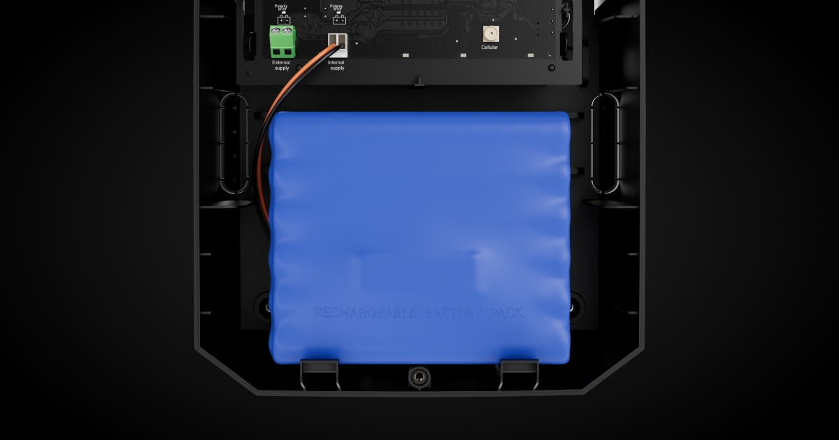 Com uma capacidade de 36 Ah, a bateria permite que Hub BP Jeweller funcione no modo Poupança de bateria até 8 meses1. Esta autonomia de longa duração é perfeita para instalações de segurança móveis, como torres de segurança portáteis ou sistemas temporários que necessitem de ser realocados frequentemente. Também é ideal para locais de construção e outros locais fora da rede que requerem monitorização constante e cobertura de segurança fiável sem depender da infraestrutura elétrica. Uma autonomia tão elevada é notável para uma bateria recarregável e reduz a necessidade de visitas frequentes de manutenção por parte de engenheiros ou empresas de monitorização para substituir a fonte de alimentação.